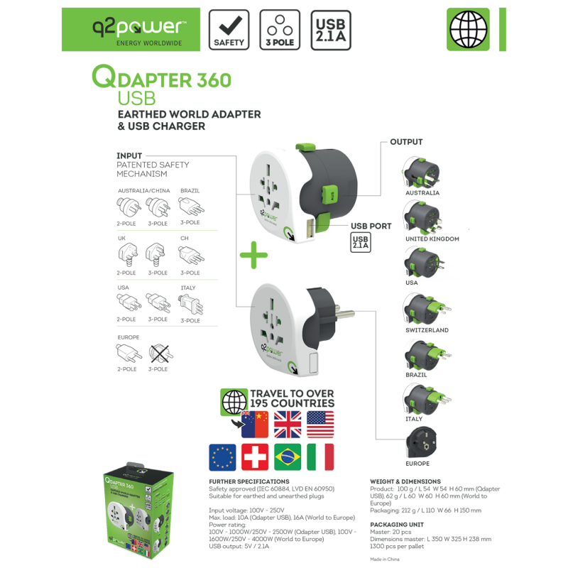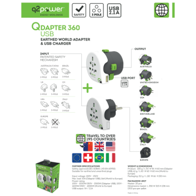 Strujni adapter, set, univerzalni + EU, USB utor, omogućuje upotrebu uređaja u skoro 120 zemalja ( Australija, USA, Brazil, Italija, Švajcarska, UK ), pogodan za uređaje sa i bez uzemljenja, USB izlaz 5V / 2.1A, ulazni napon 100V - 250V, max.opterećenje 10A, max.snaga 1000W / 2500W + EU adapter max.opterećenje 16A, max.snaga 1600W / 4000W