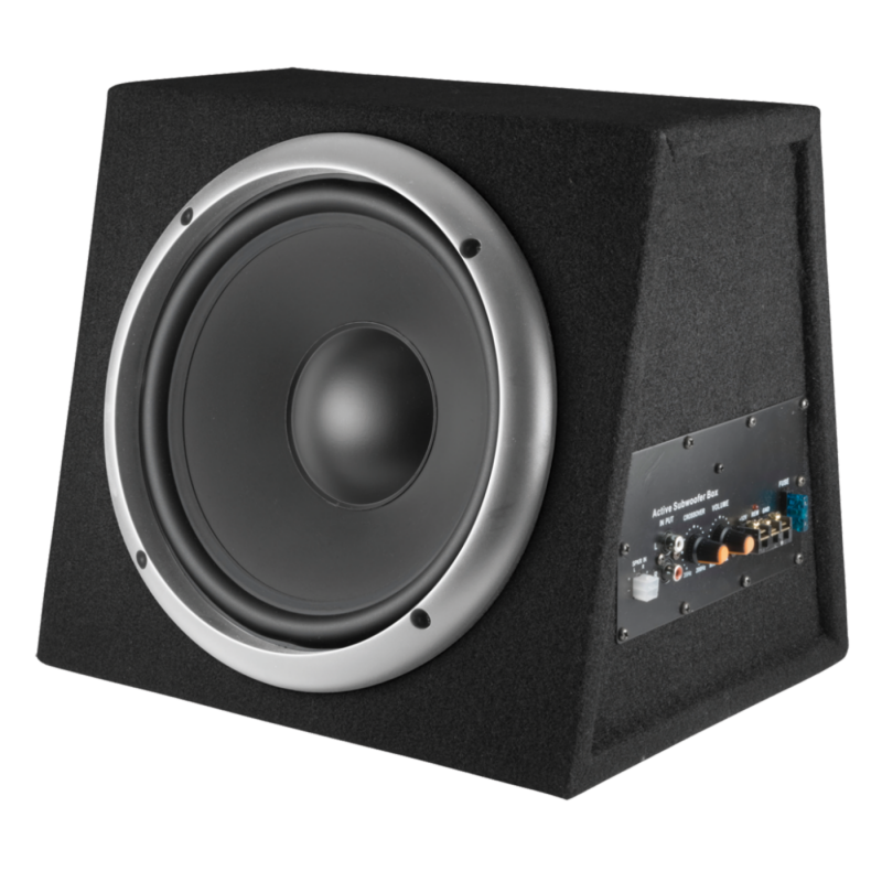 Subwoofer kutija za automobil, aktivna, pojačalo + zvučnik, zvučnik prečnika 250mm, snaga 150 / 200W, impedanca 4 Ohm, PP membrana, frekventni raspon 20 - (35) 200 Hz, podesiva skretnica 35 - 200Hz. Ugrađeno pojačalo isporučuje 100W snage. Robusna izrade, kutija odgovara svakom automobilu, daljinsko upravljanja ON/OFF, manualno podešenja zvuka, ulaz visokog signala- zvučnik, ulaz niskog signala RCA