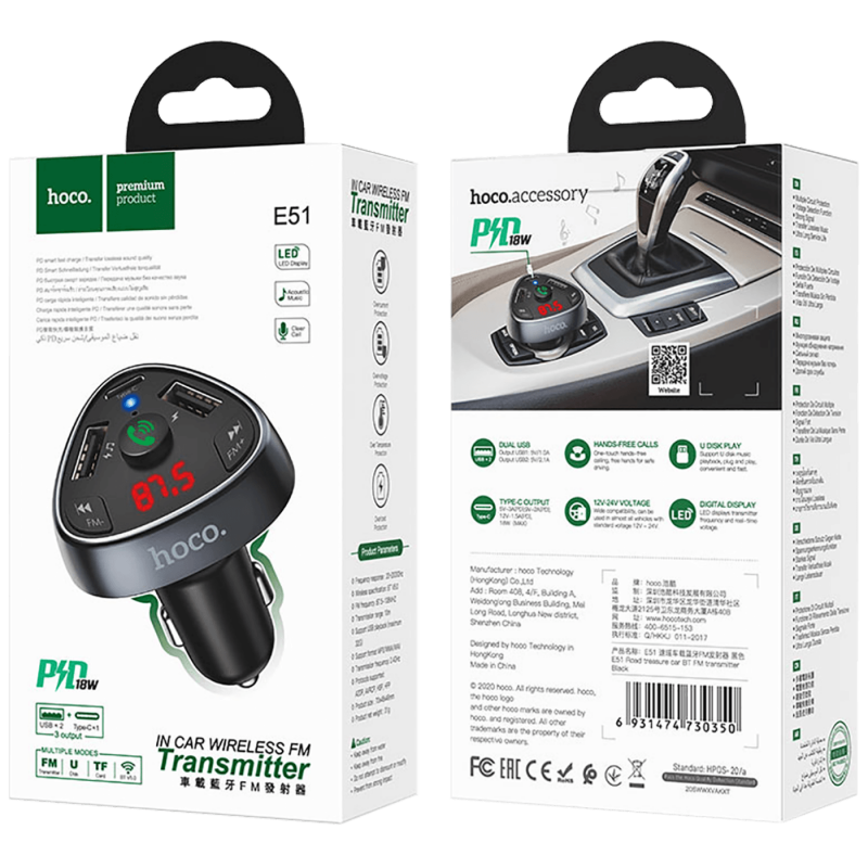 FM modulator (Transmitter), bežično povezivanje na bilo koji auto radio (87,5 - 108 MHz), Bluetooth veza za telefon v 5.0 - Handsfree , Bluetooth stereo reprodukcija glazbe, MP3, WMA reprodukcija, reprodukcija sa USB-a ( 32GB max. ), USB punjač za telefon , ulazni napon 12 - 24 V, 2 x USB izlaz, USB-A single 5 V / 2.1 A, dual USB-A ukupno 5 V / 3.1 A, type C 5 V / 3 A (PD), 9 V / 2A (PD), 2 V / 1.5 A (PD), 18 W max., dimenzije 70 x 46 x 46 mm