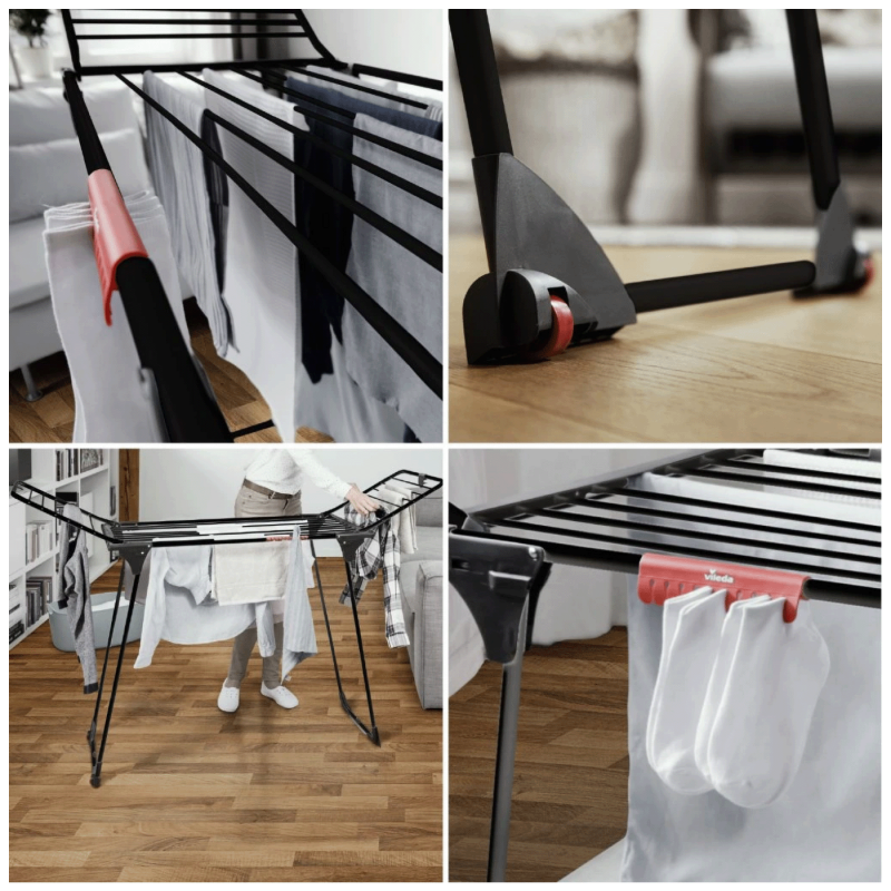 Ugrađena su kotači koji omogućuju jednostavno pomicanje susilice po prostoru, čak i kada je puna rublja. Da bi se spriječilo neželjeno preklapanje, susilica ima blokadu krila koja učvršćuje krila tijekom premještanja ili kad se uređaj ne koristi. Dva posebna držača za sitnu odjeću (npr. čarape, donje rublje) osiguravaju dodatni prostor bez zauzimanja glavne površine.