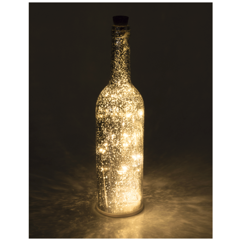 Dekorativna staklena boca, boca srebrne boje, unutarnja LED svjetlost, 8 lampica, boja svjetlosti žuta, veličina Ø 7.5 x 30cm, napajanje 3 x 1,5V AAA baterije