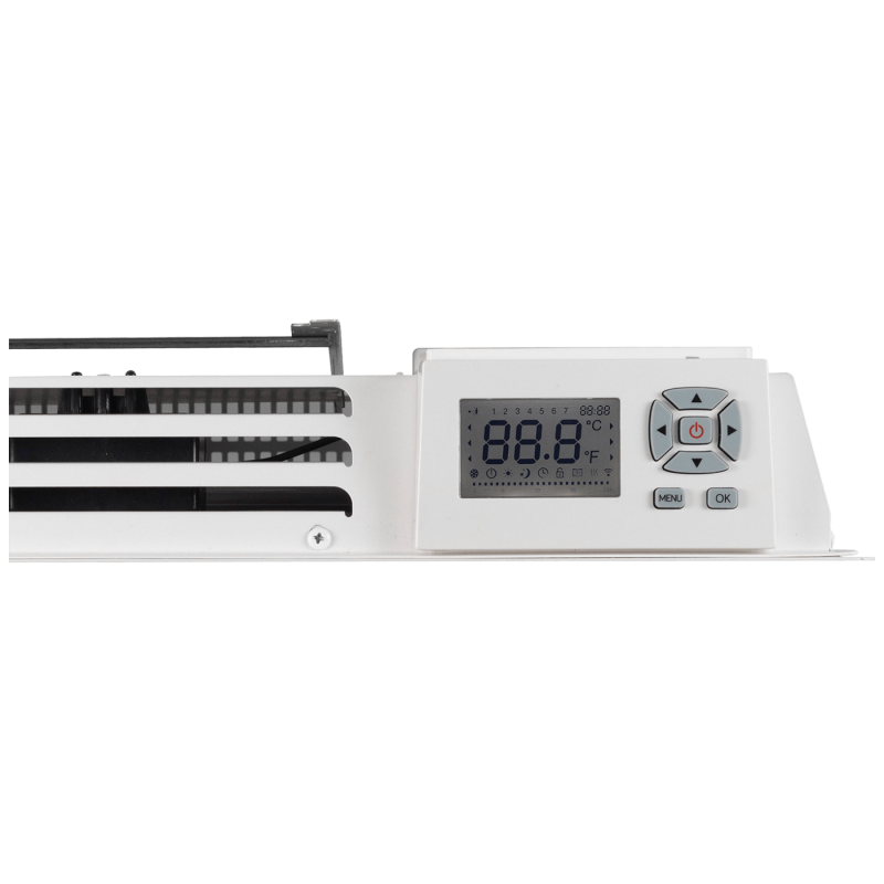 Zidna grijalica, snaga 1250 - 1500 W, LCD zaslon, linearno grijanje, ravnomjerna raspodjela topline, aluminijski grijaći element, elektronički termostat, podesiv raspon temperature 5 do 29 °C, tjedni program, funkcija zaštite od smrzavanja, detekcija otvorenog prozora