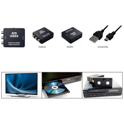Povezivanje starih uređaja ( videorekorder, DVD player, igraće konzole, video kamere, Set-Top Box, itd...) sa novijim televozorima, projektorima, pretvara analogni signal u digitalni signal, ulaz: 3 x RCA utičnica ( kompozitni video i stereo zvuk ),