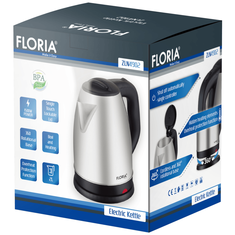 Kuhalo za vodu, snaga 1500W, maks. kapacitet 2 lit., sigurnosni poklopac za zaključavanje, automatski / ručni prekidač za uključivanje / isključivanje, svjetlosni indikator, vidljiv prozor razine vode, sa filterom