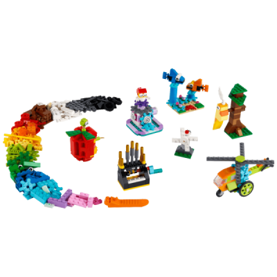 • Šta je u kutiji? – Sve što djeca trebaju da sastave balerinu koja se okreće, helikopter na guranje s funkcionalnim rotorima, jabuku s crvom koji iskače i druge modele te mnogo LEGO® kockica za kreativno slaganje