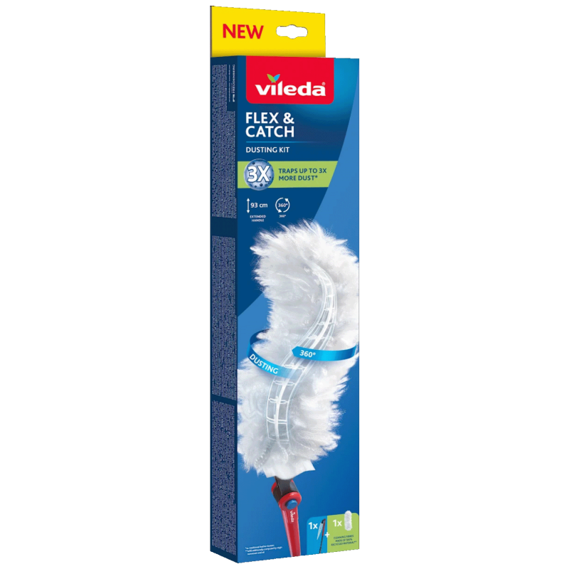 Vileda Flex & Catch je efikasan čistač prašine dizajniran tako da hvata i zadržava prašinu umjesto da je samo pomjera, čime olakšava održavanje čistoće u domaćinstvu. Ovaj alat koristi fleksibilnu glavu s mekanim vlaknima prekrivenim s obje strane, koja omogućava čišćenje teško dostupnih mjesta kao što su policе, rolete, lampe, elektronika ili prostor između ukrasa, a zahvaljujući 360° obliku glave prašina se zadržava u vlaknima umjesto da se širi po zraku. Flex & Catch je lagan i jednostavan za upotrebu, idealan za brze čišćenje prašine bez upotrebe hemijskih sredstava, i može se koristiti na različitim tvrdom površinama.