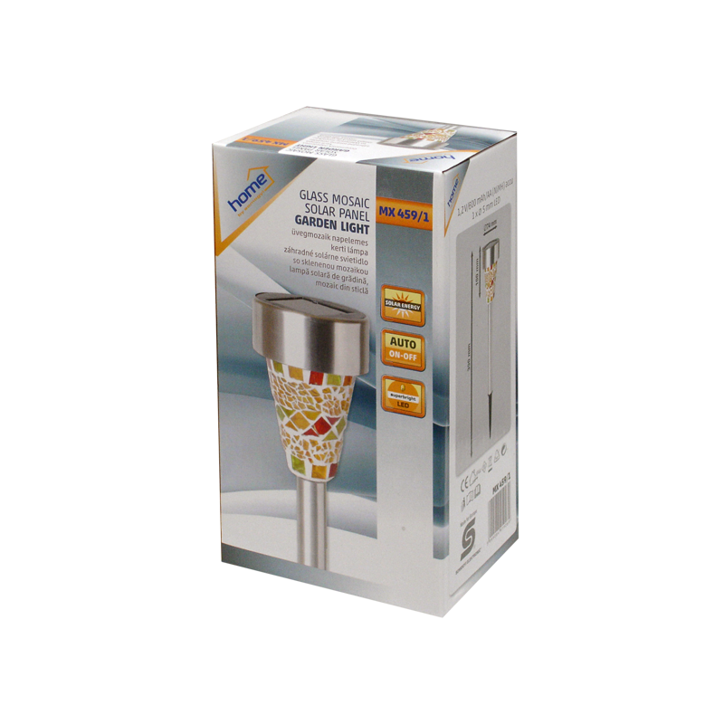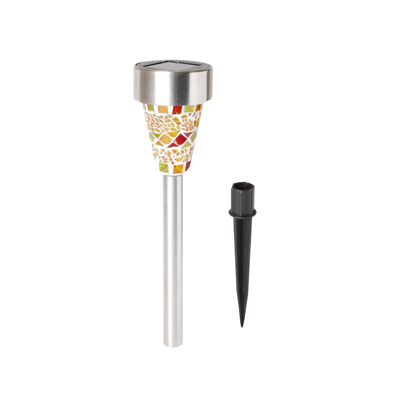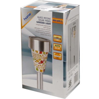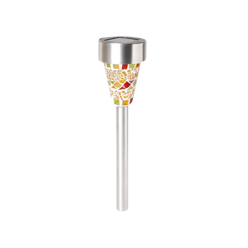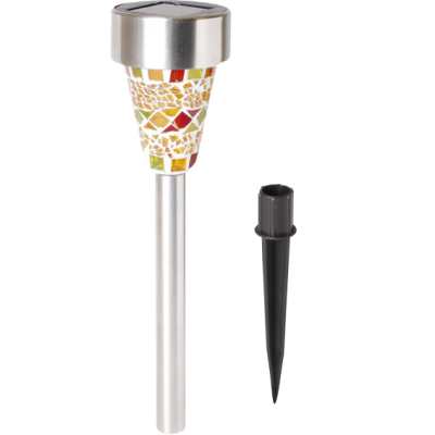 Solarna vrtna LED svjetiljka, mozaik, automatsko uključenje / isključenje, ugrađena solarna ćelija i punjač za bateriju, izvor svjetlosti bijeli LED, zamjenjiva AA NI-MH baterija 1,2V / 300mAh, otporna na vremenske uvjete, metalno / stakleno tijelo.