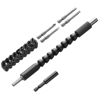 Središnji dio kompleta je električni ravni odvijač s tri razine okretnog momenta i maksimalnom snagom od 4 N·m, što omogućava preciznu i sigurnu kontrolu pri radu. Ugrađeno LED svjetlo osigurava jasnoću i u uvjetima slabog osvjetljenja, dok upravljanje jednim dodirom s tipkama za smjer naprijed/nazad čini korištenje iznimno jednostavnim. Bitovi se magnetski učvršćuju za brzu i stabilnu izmjenu.