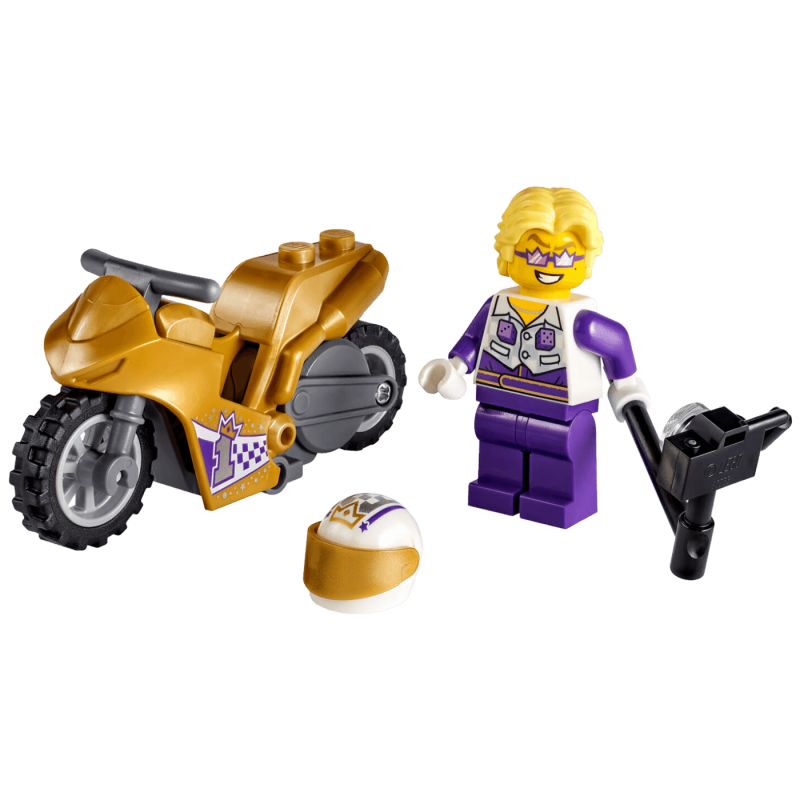 Dodaj gas na akrobatskom motociklu sa zamašnjakom i pripremi se za akciju i pustolovine s LEGO® City kaskaderima! Pridruži se zabavnom televizijskom liku Spotlightu iz serije LEGO City na ludom vozilu. Neka skoči s rampe na motociklu, napravi dramatični selfie u zraku i frajerski sleti. Ovaj kaskader voli zabilježiti svaki manevar, pa uzmi štap za selfieje i pripremi se za sljedeću zračnu fotku!