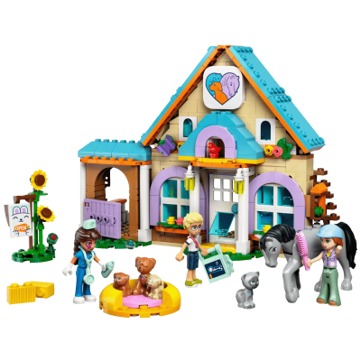 U kompletu LEGO Friends Veterinarska klinika za konje i ljubimce dobivaju 3 lutkice iz serije LEGO Friends i figure konja, mačke i 3 psa.