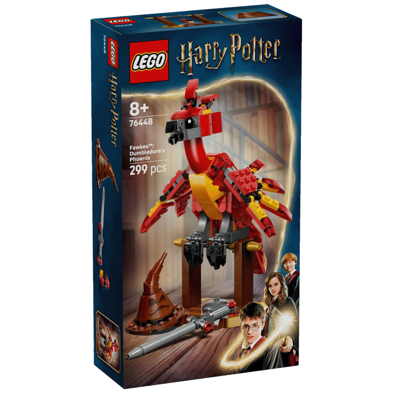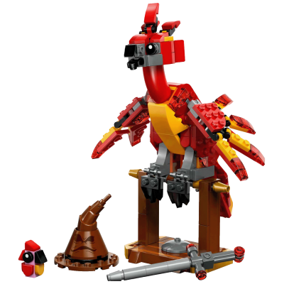 Složi feniksa Fawkesa veličanstvenog plamenog perja. Stavi ga na prečku ispod koje je pepeo. Namjesti mu glavu, kljun i krila u prepoznatljive položaje.