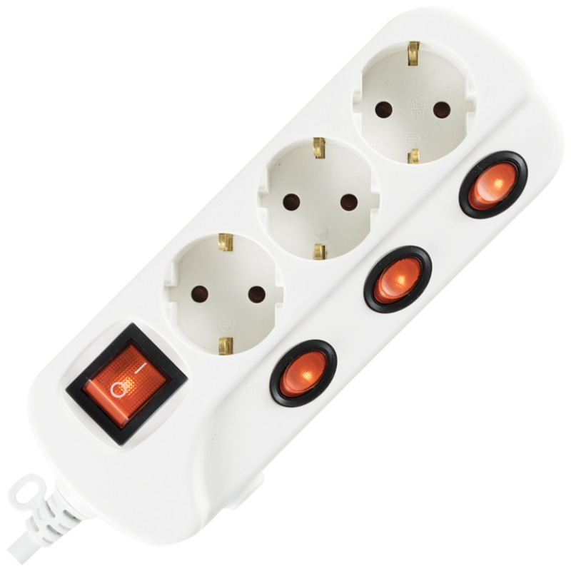 Produžni kabel sa zaštitom od preopterećenja ( termalna zaštita ), prekidač, H05VV-F 3G, 3 utičnica, 3 x 1,0 mm², dužina kabela 1.5 met., 250V AC / 16A / 3500W, reset tipka za svaku utičnicu