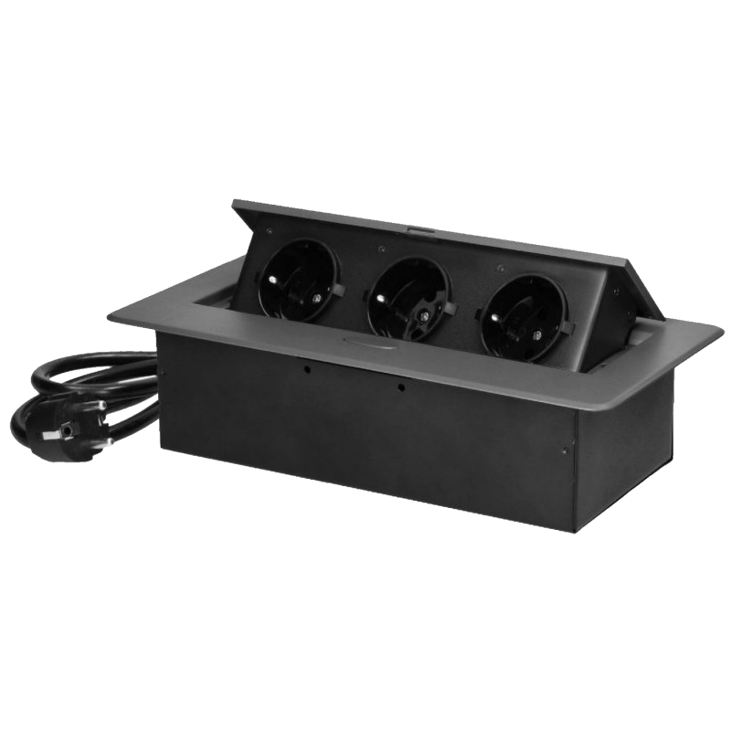 Produžni kabel sa tri Schuko utičnice, sa uzemljenjem i zaštitom strujnog kruga, koji se može integrirati u stolove, radne površine, može se montirati i okomito i vodoravno, pružajući praktičan pristup električnim utičnicama.