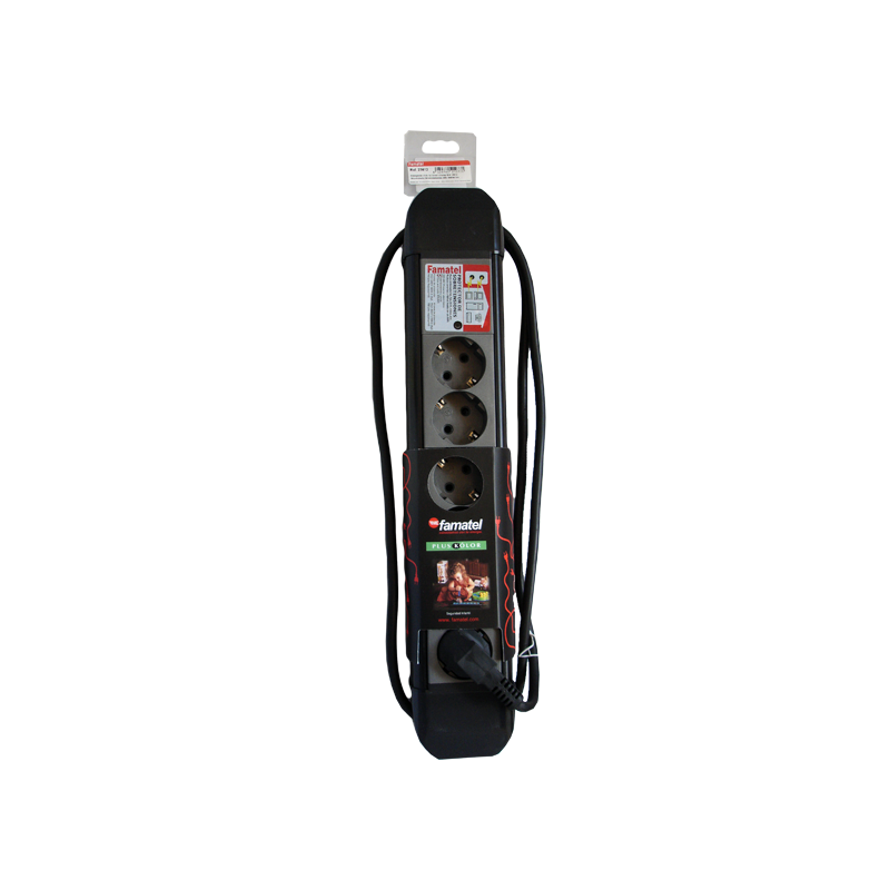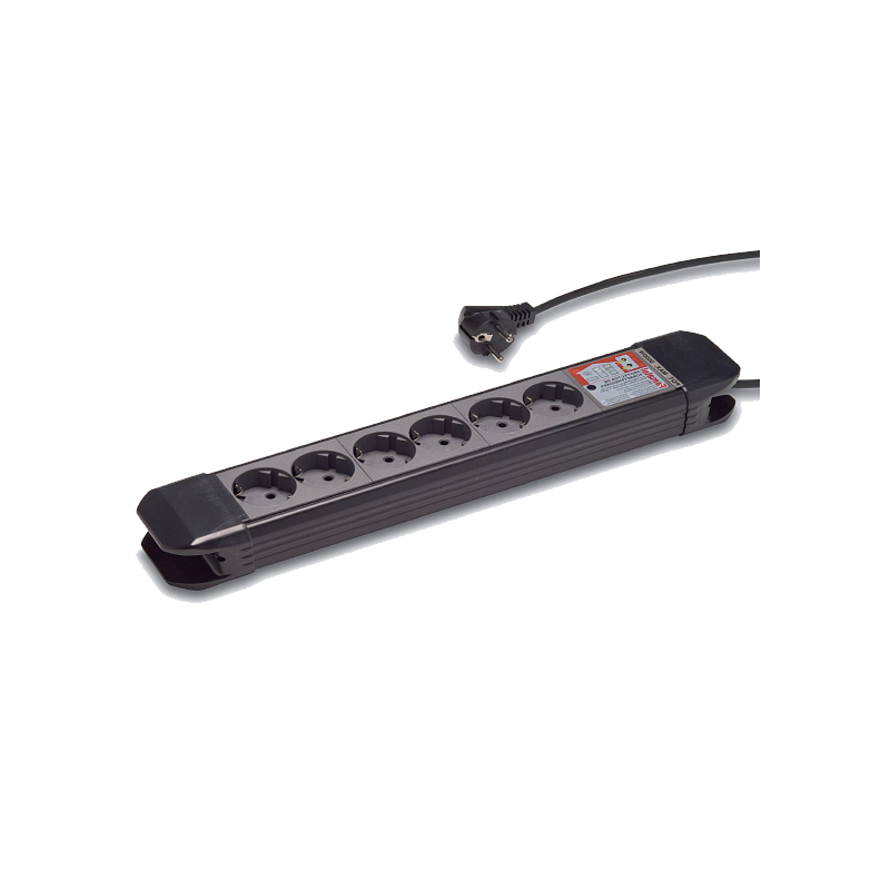 Produžni kabel sa zaštitom, 5 utičnica, dužina 1.5m, sa prekidačem, 3 x 1.5 mm², 16A/3680W, 110-250V, IK07, 6000V, 4500A, 120J, radna temperatura -25ºC + 85ºC, standard UNE 20 315-2-7 / EN 60669, crna boja.