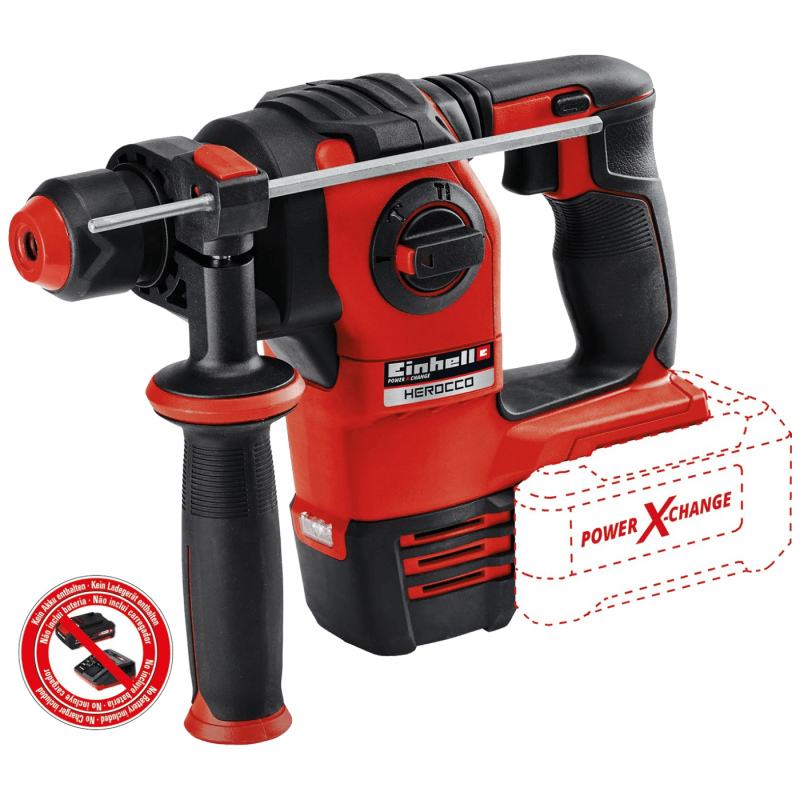 Einhell akumulatorska čekić bušilica Herocco pouzdani je alat za raznovrsne poslove: bušenja, udarnog bušenja, klesanja s fiksacijom dlijeta i bez fiksacije dlijeta. Motor bez četkica pruža više snage i osigurava duži rad s jednim punjenjem baterije. Dizajniran kao član Power X-Change obitelji, sve vrste sistemskih baterija mogu se fleksibilno upotrebljavati s alatima za radionicu ili vrt. Pneumatski udarni mehanizam, koji ima frekvenciju do 5,500 udaraca u minuti, osigurava rad bez umaranja čak i kod poslova bušenja u beton - sa snagom udarca od 2.2 J i kapacitetom bušenja u beton od 20 milimetra. Pribor se može vrlo brzo zamijeniti zahvaljujući univerzalnom SDS-plus prihvatu s funkcijom automatskog uklizavanja alata. Elektronika brzine može se fino podesiti za osjetljive radne zadatke. Za ugodan rad bez puno umaranja rukohvat je ergonomski dizajniran s mekanim gumiranim dijelovima. LED svjetlo pruža optimalno osvjetljenje radnog prostora. Proizvod se isporučuje s magnetnim adapterom za bitove u transportnom i skladišnom kovčegu E-Box. Baterije i punjač dostupni su zasebno. Za optimalne rezultate preporuča se upotreba baterije od 3,0 Ah ili jače.