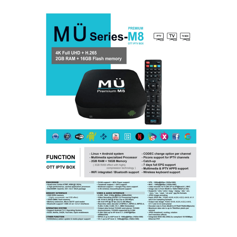 UltraHD 4K IPTV prijemnik, Linux (stalker) + Android Box , Stalker portal, Media Player, Quad Core Cortex-A7MP 1.5 GHz, 2 GB DDR4 RAM memorije, 16 GB interne memorije, proširivo sa microSD memorijskom karticom, grafička kartica Mali 200MP, H.265 10bit ( 2160p@60fps ), multimedijalni player, podrška za: mkv, wmv, mpg, mpeg, dat, avi, mov, iso, mp4, video i jpg formate, ugrađen WiFi, Bluetooth, HDMI, 2 x USB2.0, microSD slot, LAN 10/100.