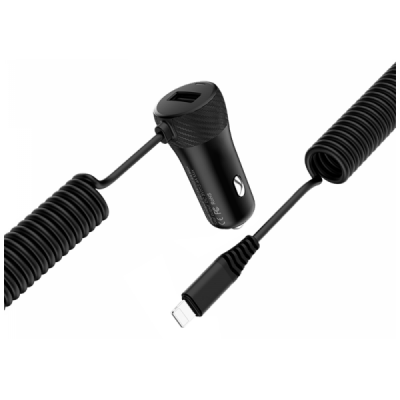 Univerzalni USB Auto punjač sa Lightning kabelom, 1 x USB, 12-24V, 5V / 2.4A, total 17 W / 3.4 A, dužina kabela 1.2 met., automatska zaštita od preopterećenja, dimenzije 55 x 26 mm, za: iPhone, iPad ...