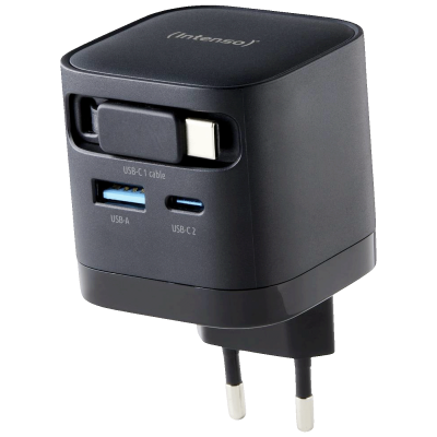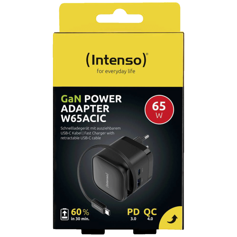 Intenso W65ACiC GaN je snažan i kompaktan napojni adapter snage 65W, namijenjen brzom i sigurnom punjenju laptopa, pametnih telefona, tableta i drugih USB uređaja. Zahvaljujući modernoj GaN tehnologiji, pruža visoku efikasnost uz manje zagrijavanje i kompaktnije dimenzije.