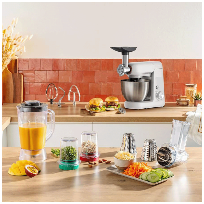 Visoke i niske brzine za savršenu izvedbu zahvaljujući raznovrsnim nastavcima i dodacima – uključujući nastavak za blender od 1,25 litara, sjeckalicu, mlin, sjeckalicu i mlin za meso