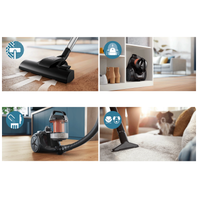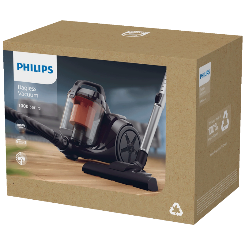 Philips VC 1000 Series je kompaktan i lagan usisivač bez vrećice, idealan za svakodnevno čišćenje doma. Zahvaljujući tehnologiji PowerCyclone 3 i snažnom 800 W motoru pruža dobru usisnu snagu za različite vrste podova. Posuda za prašinu se lako prazni, a cijeli uređaj je praktičan za korištenje i odlaganje. Višenamjenski nastavci omogućavaju detaljnije čišćenje namještaja, uskih prostora i većih površina, dok kvalitetni filteri pomažu da zrak koji izlazi iz usisivača bude čišći.