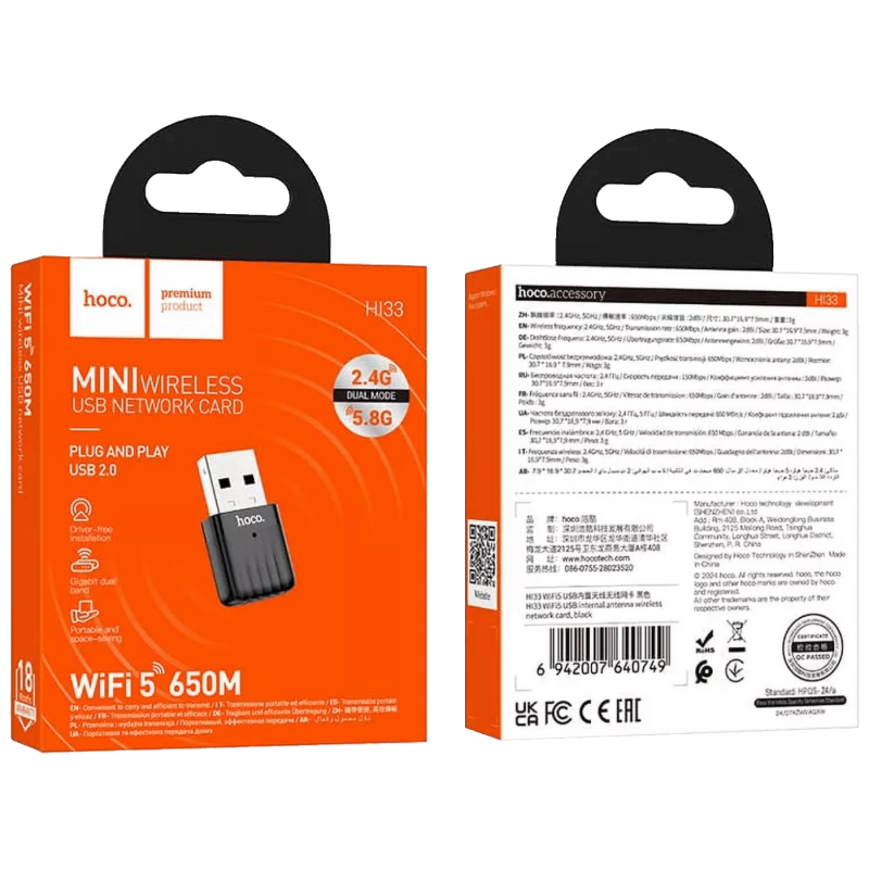 USB adapter Wi-Fi5 HOCO HI33, USB2.0, 650 Mbps