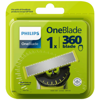 Inovativne oštrice 360 mogu se okretati u svim smjerovima kako bi se prilagodile obliku vašeg lica. Dizajn omogućuje neprekidan dodir s kožom i kontrolu. Jednostavno podrezivanje i brijanje na najteže dostupnim područjima – uz nekoliko poteza i sjajnu ugodnost. Odgovara svim proizvodima OneBlade: OneBlade (QP25xx, QP26xx, QP27XX, QP28XX), OneBlade Pro (QP6504, QP653x, QP654x, QP665x) osim QP1XXX, QI1XXX, QP652x, QP651x, QP662x, QP6505 Mijenjajte svaka 4 mjeseca