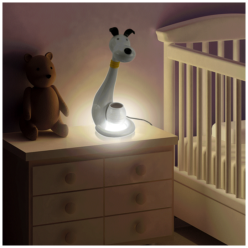 LED stolna lampa za dječije sobe, psić, snaga svjetiljke 6W, jačina svjetlosti 490 lm, izvor svjetlosti 32 + 3 SMD LED diode, kontrola na dodir, podesiva "boja" svjetlosti 3000K / 4300K / 6000K, odvojena noćna funkcija ( topla bijela ), materijala izrade ABS. Dimenzije Ø170mm x 450mm. Napajanje 230V / 50Hz, dodatno DC 12V / 350mA adapter