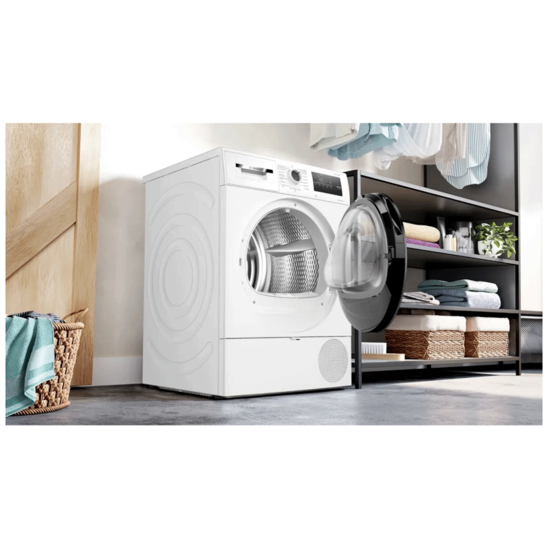 Ova sušilica dizajnirana je za pouzdano i nježno sušenje svih vrsta rublja. Zahvaljujući AutoDry funkciji, senzor vlage automatski prepoznaje kada je rublje suho i zaustavlja ciklus, čime se sprječava presušivanje i čuva kvaliteta odjeće. Sustav SensitiveDrying ravnomjerno raspoređuje topli zrak i nježno suši rublje u bubnju posebno oblikovanom za smanjenje gužvanja. Bosch WTH83255BY postiže energetsku učinkovitost klase A++, što znači niže troškove rada i manji utjecaj na okoliš. S intuitivnim LED zaslonom, jednostavnim izborom programa i tihim radom, ova sušilica čini svakodnevne zadatke ugodnijima i bržima.