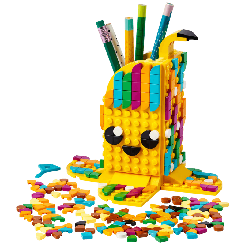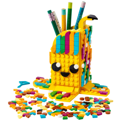 Zabavi se u kompletu LEGO® DOTS Slatka banana! Sastavi držač za olovke, a onda počni ukrašavati. Odaberi sretnu bananu, u svijetlim bojama i nasmiješenog lica, a onda je zamijeni starom, namrgođenom bananom s tačkama ili uzmi vrećicu Dodatne TAČKICE iz serije 6 (prodaje se odvojeno) i napravi nešto novo. Onda stavi držač olovaka na sto ili policu i neka ti bude od koristi!