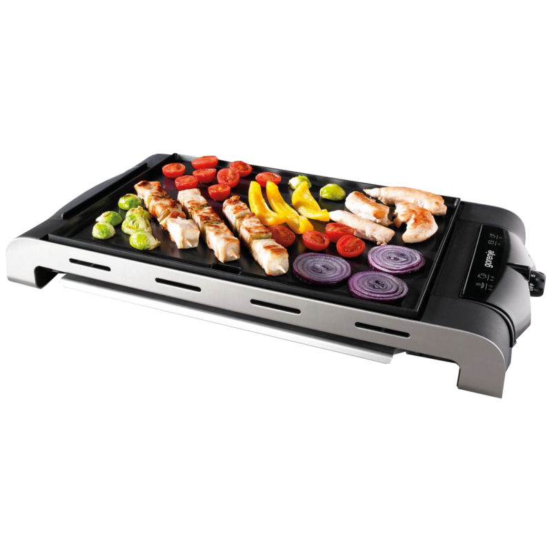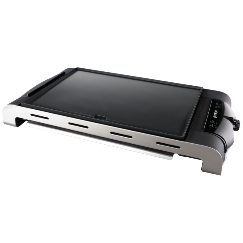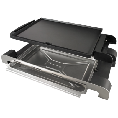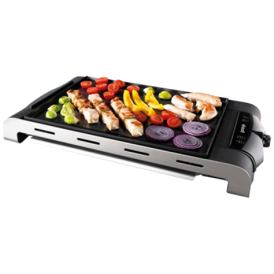 Električni roštilj sa ravnom pločom, priključna snaga 1400W, 5 nivoa temperature, podloga sa slojem protiv ljepljena namirnica, širina radne ploče 37 cm, dubina radne ploče za pečenje 27cm, toplotni indikator, odvodni kanal i prostor za skupljanje ulja, sigurnosno zatvaranje, gumirane nožice za stabilnost, hladne ručke za prenošenje, kućište od nehrđajućeg čelika