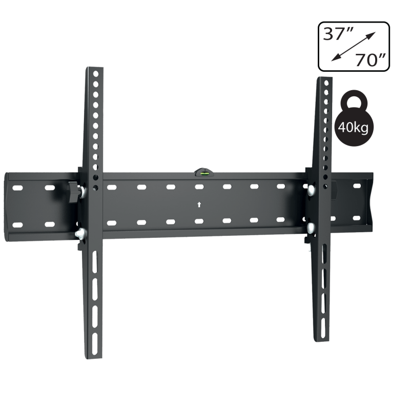 Zidni nosač za TV prijemnike 37" - 70", maximalno opterećenja 40 kg, VESA 200 x 200, 400 x 200, 300 x 300, 400 x 400, 600 x 400 mm, nagib +/-12°, jednostavna montaža, fiksno pozicioniranje, zaključavanje i brzo otpuštanje. Pakiranje: set vijaka za montažu, libela i upute za uporabu. Boja crna