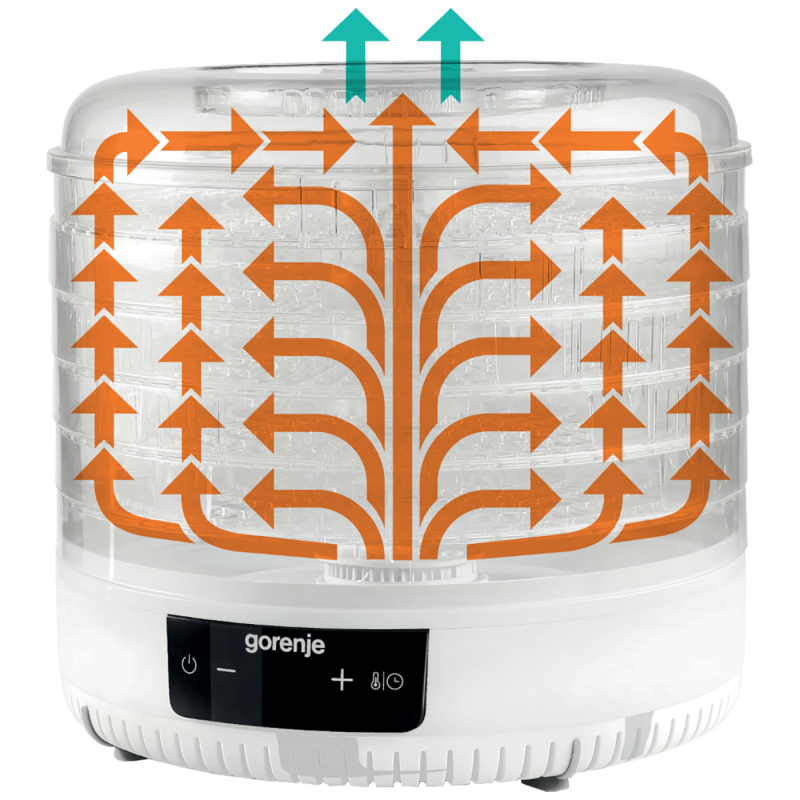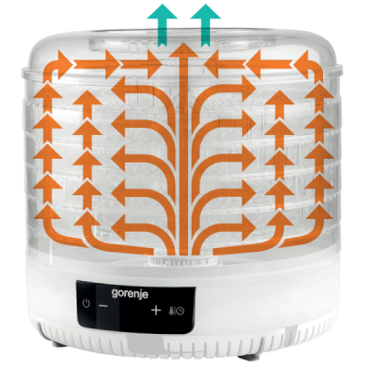 Aparat za sušenje hrane ima vertikalni protok zraka kroz aparat i to sa dna polako se kreće prema zadnjem nivou, sve uz pomoć ventilatora. Zbog ovog načina sušenja hrana u aparatu neće pomiješati mirise i arome, tako možete sušti različite vrste hrane u jednom aparatu u isto vrijeme.