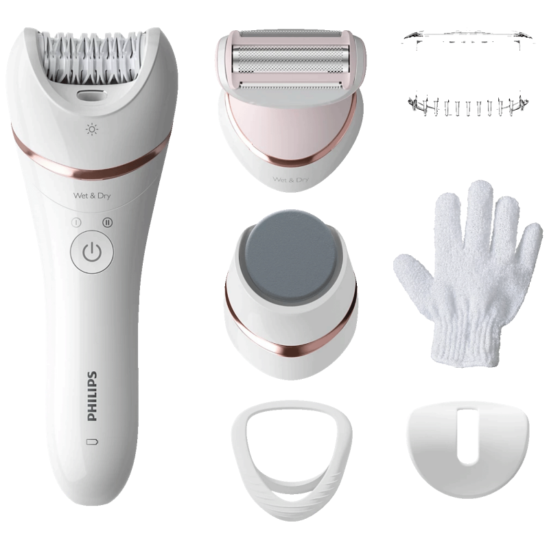 Komplet dolazi s raznovrsnim dodacima poput depilacijske rukavice za piling, turpije za stopala, glave za brijanje i češlja za oblikovanje bikini zone – sve što ti treba za kompletnu rutinu njege tijela.
