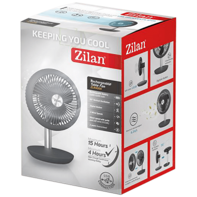 Ventilator stolni, USB priključak, vertikalna oscilacija do 90°, 4 brzine rada, digitalne tipke, ugrađena baterija 3.800 ~ 4.000 mAh, vrijeme rada 4 h ( velika brzina), 15 h ( tiho ), razina buke ( tiho ) ≤32dB, odvojiva prednja zaštita, jednostavno za čišćenje