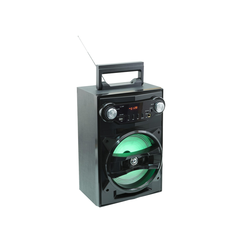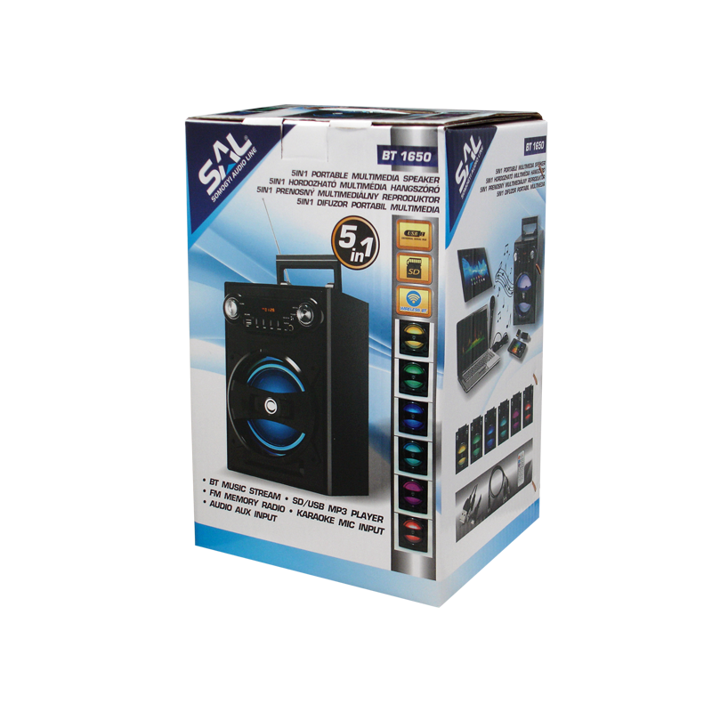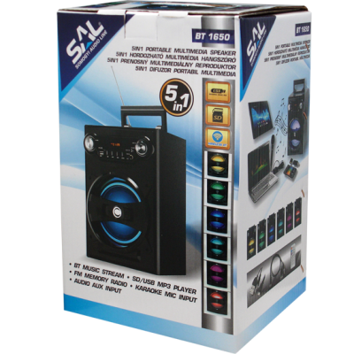 Prenosivi multimedijalni zvučnik sa daljinskim upravljačem, 5in1, pojačalo snage 25W, Bluetooth, ugrađen FM radio sa automatskim traženjem stanica, opseg 87,0 - 108,0 MHz, MP3 player, reprodukcija sa USB-a , SD memorijska kartica, AUX ulaz, MIC ulaz 6,3mm, Bluetooth spajanje sa Smartphone-om - Handsfree, KARAOKE, LED display sa promjenjivim pozadinskim osvjetljenjem, LED diode koje mijenjaju boju, EQ postavke. Ugrađena Li-Ion baterija. Materijal izrade , drvena kutija sa ručkom za nošenje